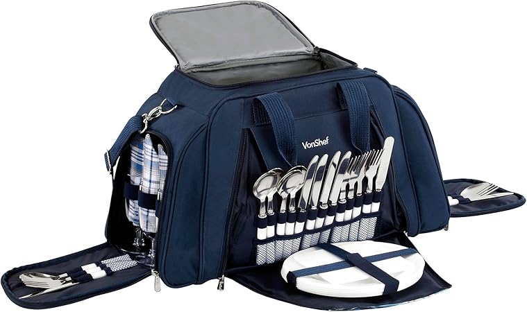 - Vonshef 6 Person Holdall Picnic Bag With Cooler Compartment Includes Plates Cutlery Glasses Tableware Navy Tartan Amazon Co Uk Garden Outdoors