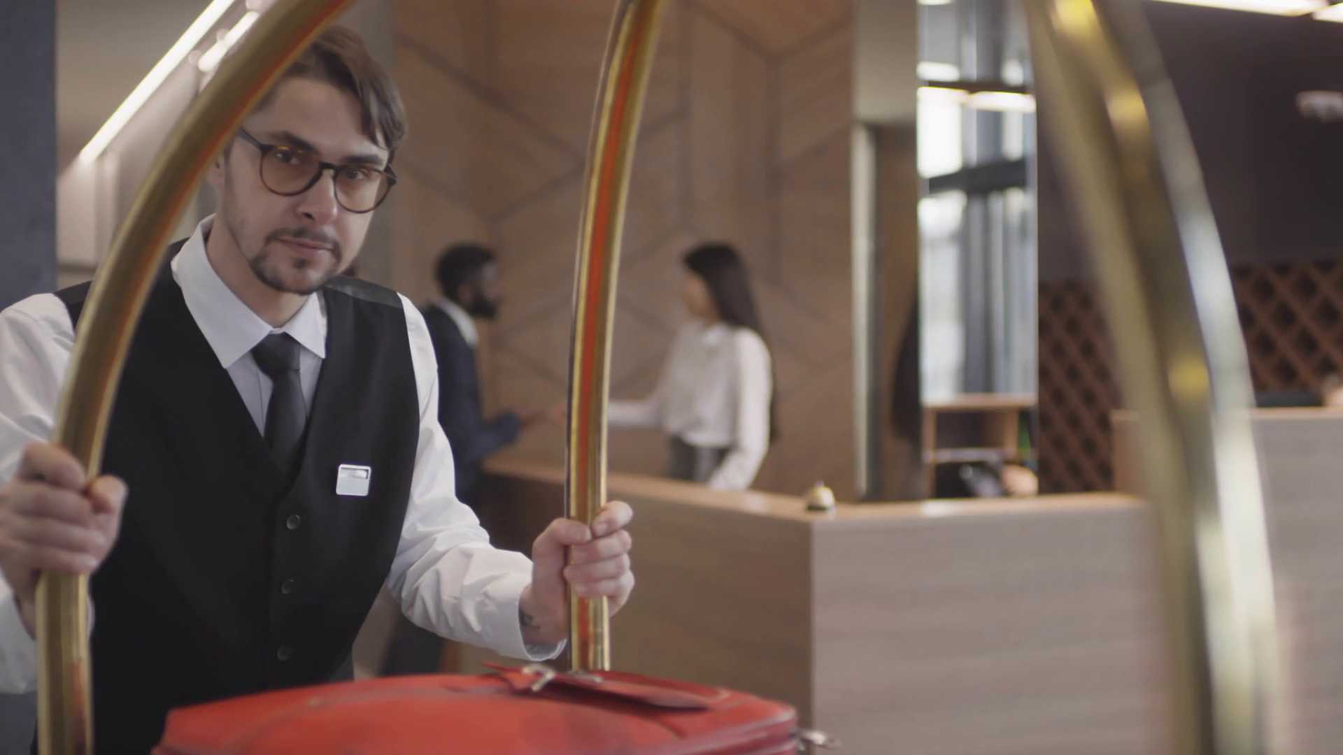 - Tracking Shot Of Focused Bellman In Glasses And Uniform Pushing Luggage Cart Along Hallway And Through Lobby Of Hotel Stock Video Footage Storyblocks