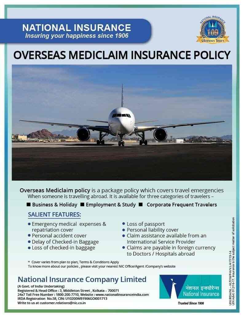 National insurance company ltd a government of india undertaking has overseas mediclaim policies for the travelers who travel overseas which takes care of their health needs in overseas. In fact its the oldest general insurance company in india. Along with the reimburseable and hospitalization medical expenses these plans provides a nominal coverage for loss of passport baggage loss baggage delay.