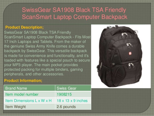 Find, Read, And Discover Swissgear Sa1908 Black Tsa Friendly Scansmart Laptop Computer Backpack, Such Us: