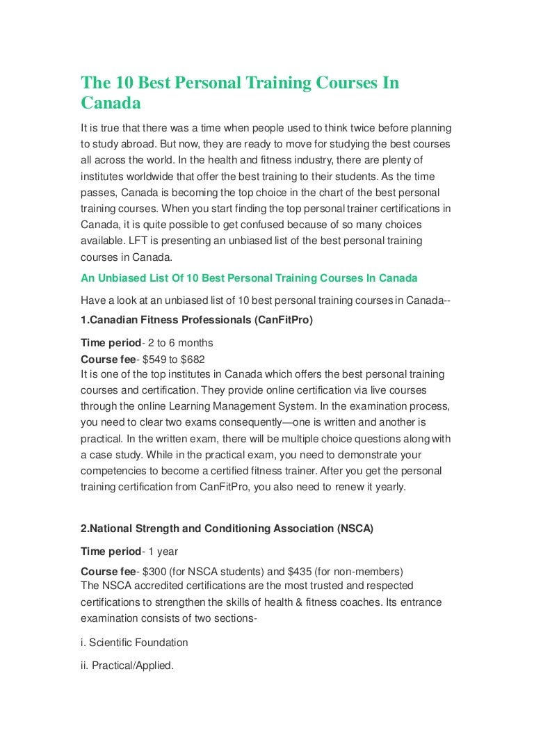 1397 5990 depending on the specific. The best choices in canada is an all inclusive guide that will help you launch your successful personal training career by choosing the right personal training certification. Its a nationally recognized program thats based on the optimum performance training opt model and is ncca accredited.